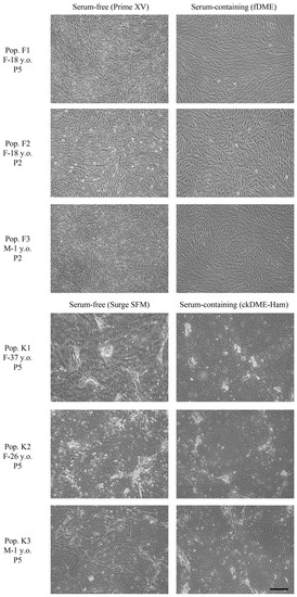 Phase contrast microscopy of fibroblasts (F) and keratinocytes (K) from different donors cultured in serum-free or serum-containing medium. Fibroblasts from population 1 are at passage 5, and population 2 and 3 are at passage 2. The three populations of keratinocytes are at passage 5. F: female; M: male; y.o.: year(s) old; P: passage. Scale bar: 200 μm.