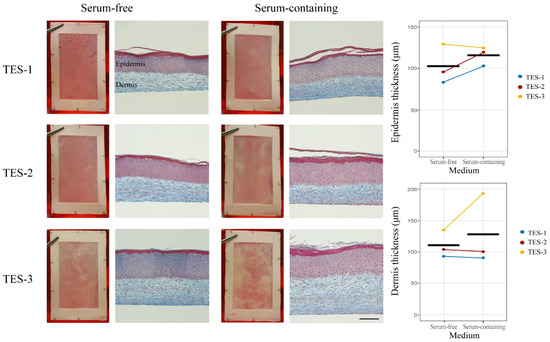 Histologically, TESs cultured with either serum-containing or serum-free media exhibited an epidermis covering the dermal component. All typical layers of the human epidermis were present. The stratum basale was organized in the typical cuboidal cell layer in palisade fashion. The stratum spinosum, stratum granulosum, and stratum corneum were also present in all conditions (Figure 2). The thickness of the epidermis and dermis was not significantly different between the two conditions (p-value of 0.2814 and 0.4830, respectively). The dermal thickness and the epidermal thickness of TES-3 were greater than those of the two others (Figure 2). That is expected, since cells from a newborn, such as TES-3, are more proliferative and produce thicker substitutes compared to adult cells.