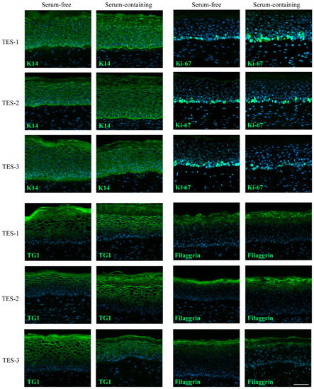 Analysis of skin markers in TES-1, TES-2, and TES-3 produced with keratinocytes and fibroblasts from different donors (see Table 1), matured in vitro in serum-free or serum-containing media. Immunofluorescence staining against keratin 14 (K14), Ki-67, transglutaminase 1 (TG1), and filaggrin. Cell nuclei were stained with Hoechst reagent. The quantification of image signal is presented in Figure 4. Scale bar: 50 μm.