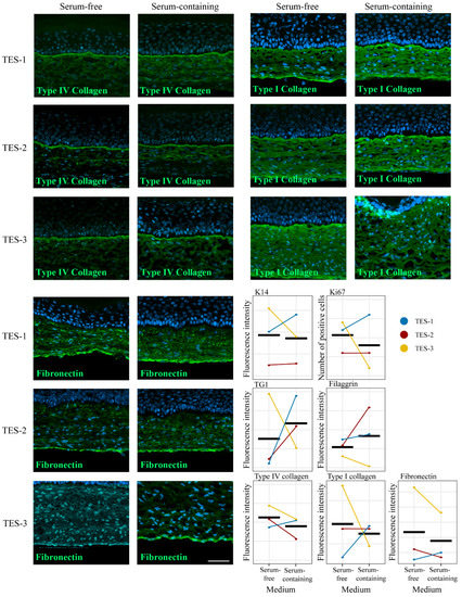 Analysis of skin markers in TES-1, TES-2, and TES-3 produced with keratinocytes and fibroblasts from different donors (see Table 1), matured in vitro in serum-free or serum-containing media. Immunofluorescence staining against type IV collagen, type I collagen, and fibronectin. Cell nuclei were stained with Hoechst reagent. Scale bar: 50 μm. Fluorescence intensity was measured using ImageJ 53e software [25] for markers from Figure 3 and Figure 4. The solid black line represents the mean. Linear mixed-effect model with paired samples was used to compare the effect of media on marker expression. No statistically significant effect of condition was detected (p > 0.05).