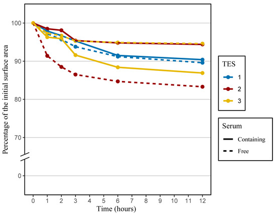 Contractile behavior of TES-1, TES-2, and TES-3 produced with keratinocytes and fibroblasts from different donors (see Table 1), matured in vitro. TESs produced with serum-free medium are in dashed lines, and TESs produced with serum-containing medium are in solid lines. TES-1 (blue curves), TES-2 (red curves), and TES-3 (yellow curves) were placed on an agar substrate, and the surface area of the skin substitutes was measured over time to obtain contraction kinetic curves; n = 3.