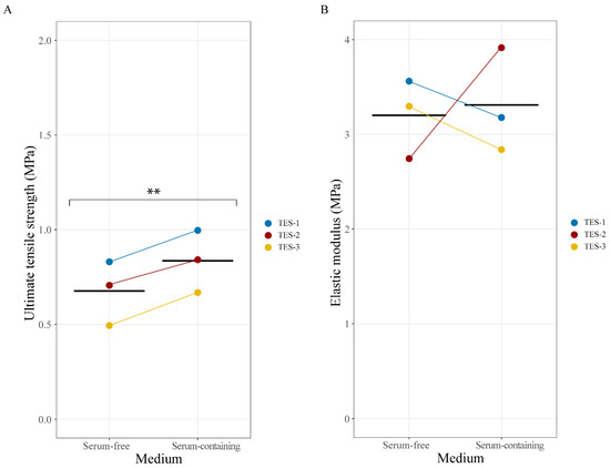 (A). Ultimate tensile strength (ETS) and (B). elastic modulus (EM) of TES-1, TES-2, and TES-3 produced with keratinocytes and fibroblasts from different donors (see Table 1), matured in vitro in serum-free or serum-containing media. TES-1 is represented in blue; TES-2 is in red; and TES-3 is in yellow; n = 3 replicates for each donor. The solid black line represents the mean. A linear mixed-effect model with paired samples was used to compare the effect of media on mechanical properties. ** p < 0.01.