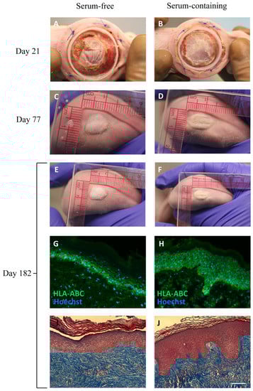 Macroscopic aspect (A–F), immunolabeling for the human histocompatibility complex HLA-ABC (G,H), and histological analysis (I,J) of TES-4 produced with serum-free or serum-containing media and grafted on athymic mice, at 21, 77, and 182 days. Scale bar (G–J): 100 μm.
