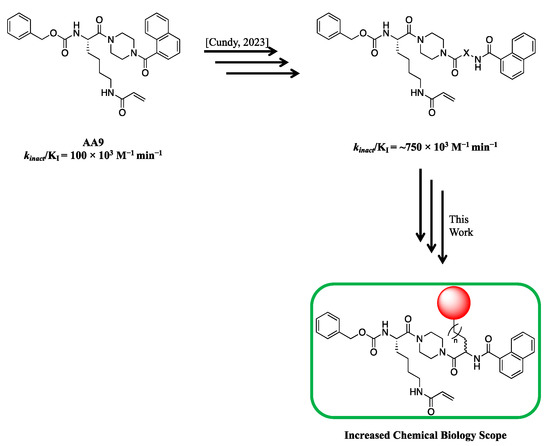 Relative to the original scaffold, we expected the potency of these novel chemical biology tools to decrease slightly, due to the additional bulk incorporated on the glutamate sidechain. Although we expected the sidechain moiety to be directed into bulk solvent, we were concerned that its mass and charge would disfavor the binding interaction. Therefore, we kinetically characterized these probes as rigorously as possible, in order to determine their relative affinity and reactivity. For most inhibitors we have made, including the parent inhibitor AA9 (Figure 1), we have been able to measure kinetic parameters under Kitz and Wilson conditions [37]. This experimental approach is based on the use of a continuous activity assay [38] and the measurement of first-order rate constants for the time-dependent inactivation of enzyme (see Figure 2A and Figures S1–S5 in Supplementary Materials). The dependence of these observed rate constants (kobs) on the inhibitor concentration divided by alpha ([I]/α) can then be fitted to a hyperbolic saturation model where the upper plateau represents the rate constant of inactivation (kinact), and the concentration providing half the rate constant of inactivation represents KI (Figure 2B) [26,27,39]. Aside from inhibitor 22, the inhibitors disclosed herein exhibited excellent rates of inactivation; however, this assay was unable to provide reliable values for the observed rate constants (kobs) at high concentrations and, thus, was a poor saturation fitting. To compensate for this, the overall efficiency of the inhibitor (kinact/KI) can be derived from the slope of the linear region of the saturation plot (Figure 2C). To gauge the individual parameters, a double reciprocal fitting was also employed where KI can be calculated from the x-axis intercept and kinact can be calculated from the y-axis intercept (Figure 2D).