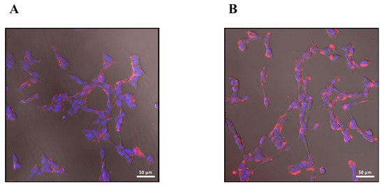 We elected to use the rhodamine B-labelled 29 (NCEG-RHB) in subsequent fluorescence microscopy studies in SH-SY5Y cells due to its high solubility and desirable photochemical properties. SH-SY5Y cells can be differentiated upon the addition of retinoic acid, which induces overexpression of TG2 [48,49,50]. As shown in (Figure 3A), compound 29 (aka NCEG-RHB) is cell permeant and clearly visible in the cytoplasm, but not in the nucleus. A noticeable increase in red fluorescence is observed in cells pre-treated with retinoic acid treatment, suggestive of an increased expression and labelling of intracellular TG2 (Figure 3B).