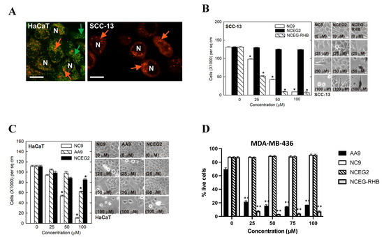 Treatment of cancer cells with cell-permeable and cell-impermeable inhibitors. (A) HaCaT and SCC-13 are epidermis-derived cutaneous squamous cell carcinoma cells that were treated for 10 h with NCEG-RHB prior to imaging using a spinning disc confocal microscope. NCEG-RHB localization is detected adjacent to the nuclei (N) in both cell types and is indicated by red arrows. The HaCaT cell cultures were also stained for 15 min with MitoTracker Green before imaging. MitoTracker Green detects mitochondria membrane proteins inside the cell and the labelling is indicated by green arrows. White scale bars = 100 µm. (B) SCC-13 cells treated with cell-impermeable inhibitor 18 (NCEG2) and cell-permeable inhibitors NC9, AA9, and NCEG-RHB. Scale bars represent 50 µm; (*) p value < 0.001 (C) HaCaT cells treated with cell-impermeable inhibitor 18 (NCEG2) and cell-permeable inhibitors NC9 and AA9. Scale bars represent 50 µm; (*) p value < 0.001. (D) MDA-MB-436 cells treated with cell-impermeable 18 (NCEG2) and with cell-permeable inhibitors NC9, AA9 and NCEG-RHB. Experiments were carried out in triplicate and are represented as average ± SD of the percentage of living cells; (**) p value < 0.01.
