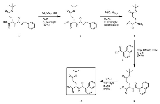 Starting from commercially available Z-Glu(OtBu)-OH (1), a methylation was performed to generate the corresponding methyl ester 2 (Scheme 1). The Cbz protecting group was then removed by palladium catalyzed hydrogenolysis to liberate the N-terminus on glutamate 3. Acylation with 1-naphthoyl chloride 4 was then performed under basic conditions with triethylamine to generate the protected intermediate 5. Finally, hydrolysis of the C-terminal ester generated the naphthoyl-glutamate intermediate 6 to be used in the convergent synthesis described below (Scheme 2).