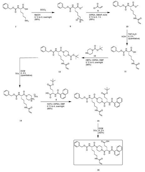 Commercially available Z-Lys-OH (7) was subjected to methyl esterification using thionyl chloride and methanol to protect the C-terminus and generate 8 (Scheme 2). The addition of the acrylamide warhead was achieved by reaction with acryloyl chloride 9 and Hünig’s base to yield the acrylated lysine 10. The C-terminal ester of 10 was then hydrolyzed to produce 11, which was subsequently coupled to N-Boc-piperazine 12, using HATU, to gain access to the Boc-protected amine 13. Removal of the Boc group with TFA delivered intermediate amine 14 as its TFA salt. Coupling 14 with the glutamate intermediate 6 produced the t-butyl ester 15. A final hydrolysis of this ester using TFA exposed the ɣ-carboxylate of the glutamate and provided key intermediate 16.