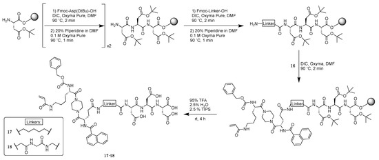 Once key intermediate 16 was acquired, cell-impermeable inhibitors were generated by SPPS, allowing all inhibitors to be prepared on-resin in an automated peptide synthesizer (Scheme 3). Starting from manually pre-loaded Fmoc-Asp(OtBu)-Wang resin, two sequential cycles of coupling with Fmoc-Asp and Fmoc deprotection were performed. The resulting tri-Asp peptide was then further derivatized to either incorporate an aminohexanoic acid linker or a tri-Gly linker by further cycles of SPPS. A final coupling with key intermediate 16 executed by the peptide synthesizer produced the protected precursors bound to Wang resin. The resin was subsequently cleaved, and the remaining protecting groups were removed using TFA to yield the cell-impermeable inhibitors 17 and 18, which were purified by semi-preparative reverse phase HPLC.