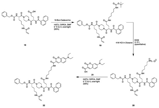 To make fluorescent probes starting from key intermediate 16, fluorescein, coumarin, and rhodamine B fluorophores were linked to the scaffold through a cadaverine spacer (Scheme 4). Compound 16 was subjected to amide coupling with HATU to attach N-Boc-Cadaverine to the glutamate residue. The intermediate amine 19 was then deprotected using 4 M HCl in dioxane and free amine 20 was coupled to the diethylamino coumarin probe 21. This yielded the coumarin fluorescent probe compound 22 in 59% yield. The addition of FITC to cadaverine intermediate 20 generated fluorescein probe 23 (Scheme S1 in Supplementary Materials).