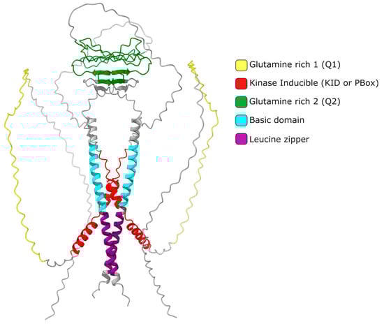 The similarity between the Creb and Crem genes lies in several aspects. Firstly, their first exon does not contain a coding sequence (CDS), and the start translation codon is located in the second exon. In addition, both proteins possess two glutamine-rich activation domains and a P-box site for phosphorylation by PKA, encoded by two exons. The carboxyl terminus of both proteins contains a basic region containing the leucine zipper domain (bZIP) (Figure 2), which allows for DNA binding and homodimerization as well as heterodimerization [7].
