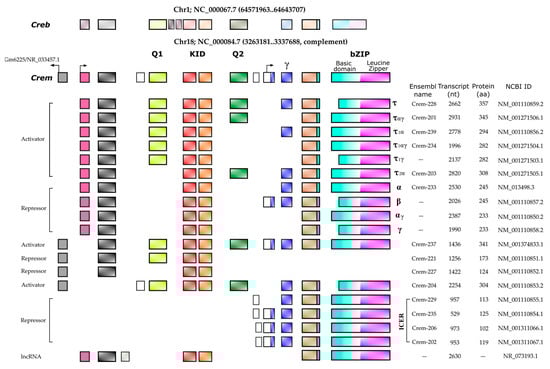 Mouse Crem isoforms. The structure of 18 confirmed isoforms at transcriptional and protein levels is shown. The mouse Crem gene is located on chromosome 18 in the complementary strand where two lncRNAs (NR_073193.1 and Gm6225) are located in the sense and antisense direction, respectively. The Creb gene is shown above for comparison. The CREM domains in the gene structure are highlighted in different colors at the top and the composition of each isoform is shown. For identification, the Ensembl name of each isoform, the length of the gene in nucleotides (nt), the protein length in amino acids (aa) and the corresponding NCBI ID are listed.