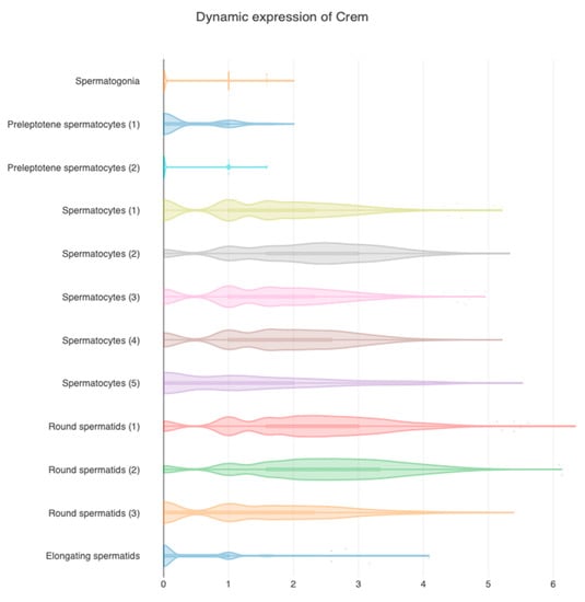 Crem expression at different stages of spermatogenesis. The scRNAseq data set from germ cells of male C57BL/6J mice, in which the stages of sperm formation were assigned using cell-type-specific markers [28]. The Crem expression query indicates different expression levels for each stage of spermatogenesis. The highest expression is observed in round spermatids, and the lowest in preleptotene spermatocytes (1 and 2). Numbers on the x-axis indicate expression intensity as fragments per kilobase of the transcript per million fragments (FPKM). The figure was made using the reprogenomics viewer portal (rgv.genouest.org) with data from [28].