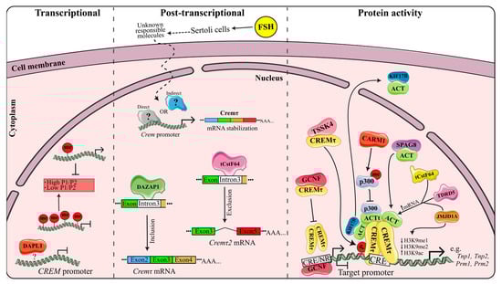 CREM is widely recognized as a crucial regulator of spermatogenesis; therefore, the comprehension of its modulation at all levels is relevant. A well-established aspect is the direct regulation of CREM activity by ACT-KIFL7b, while the involvement of other ACT-like factors is still largely unclear (see [16] for the latest review). This section focuses on analyzing recent reports on new CREM modulators at transcriptional, post-transcriptional and post-translational levels and their mechanisms, which are summarized in Figure 4.