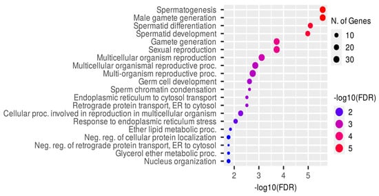 The most comprehensive analysis of differential gene expression in testes from Crem-knockout (KO) mice was conducted by Kosir et al. in 2012, and their study is the only one for which raw data are available. They reported a total of 4706 genes that exhibited differential expression, with 1822 genes down-regulated and 2884 genes up-regulated. However, it is important to note that a significant number of these genes are likely to be regulated indirectly, since in the absence of CREM, the expression of about 85 TFs is altered, with approximately 40 TFs directly bound to CREM. In total, they were able to identify around 1607 genes to which CREM binds directly [54,55]. But when applying a log2FC cut-off of 1, a total of 1098 deregulated genes are identified, with the majority (824 genes) showing deregulation, contrary to the findings reported by Kosir et al. [55]. Importantly, out of the 1098 genes, only 354 genes (32.24%) are bound by CREM. Notably, only down-regulated genes are primarily associated with spermatogenesis, whereas the up-regulated genes (274 genes) are involved in the response to xenobiotic stimuli and the processing of oxoacids, carboxylic acids and xenobiotics, among others (File S2). Of all the down-regulated genes, the gene ontology (GO)–biological processes of the genes bound by Crem are more diverse than the overall set of genes, which have a higher relative representation in GO terms related to spermatogenesis (Figure 5, File S2), possibly reflecting arrest in the round spermatid phenotype. Among the down-regulated genes, those involved in fertilization or spermatogenesis represent approximately 90 genes, with at least 35 gene promoters being directly bound by CREM (Table 1).