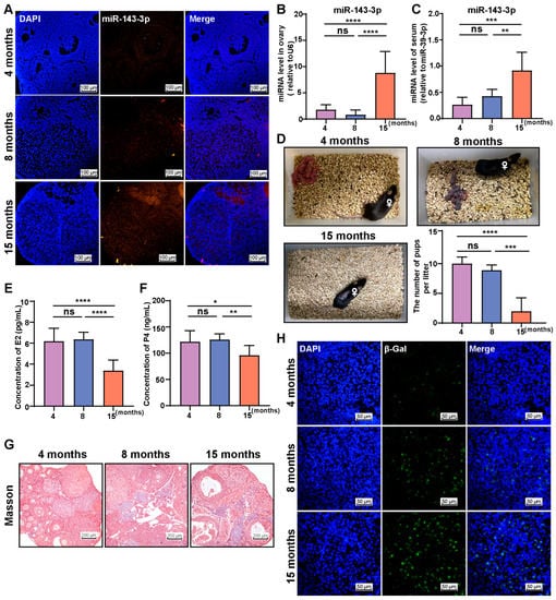 miR-143-3p is highly expressed in the ovaries of aged mice. (A) Representative fluorescence in situ hybridization images of miR-143-3p expression in ovarian tissue from young and aged mice. The scale bar = 100 μm. (B) Expression level of miR-143-3p in ovaries from mice of different ages. (C) Expression level of miR-143-3p in serum from female mice of different ages. (D) Fertility analysis of mice of different ages. (E) Serum E2 concentration in mice of different ages. (F) Serum P4 concentration in mice of different ages. (G) Masson staining of the ovaries from mice at different ages. The scale bar = 200 μm. (H) Representative images of β-galactosidase staining in ovarian tissue from mice of different ages. The scale bar = 50 μm. All data are presented as the mean ± SD from at least three independent experiments. * p < 0.5, ** p < 0.01, *** p < 0.001, **** p < 0.0001, ns = not significant.