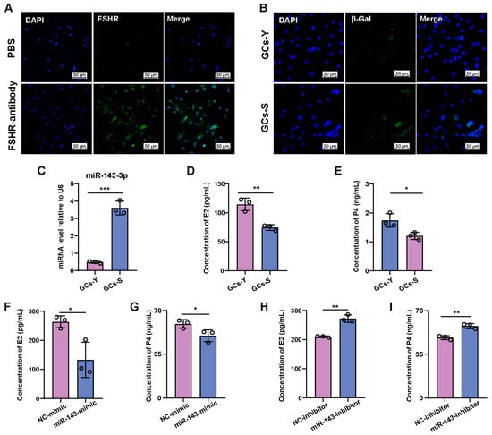 miR-143-3p inhibits E2 and P4 synthesis in GCs. (A) FSHR immunofluorescence of GCs isolated from ovaries. The scale bar = 50 μm. Green, FSHR positive. Blue, DAPI. (B) β-galactosidase staining in young and senescent GCs. The scale bar = 50 μm. Green: β-galactosidase positive. (C) Expression level of miR-143-3p in young and senescent GCs. (D,E) E2 and P4 concentrations in culture supernatant from young and senescent GCs. GCs-Y = young GCs, GCs-S = senescent GCs. (F,G) E2 and P4 concentrations in culture supernatant from GCs transfected with an miR-143-3p mimic. (H,I) E2 and P4 concentrations in culture supernatant from GCs transfected with an miR-143-3p inhibitor. NC-mimic = mimic negative control, NC-inhibitor = inhibitor negative control. Data are presented as the mean ± SD from at least three independent experiments. * p < 0.5, ** p < 0.01, *** p < 0.001.