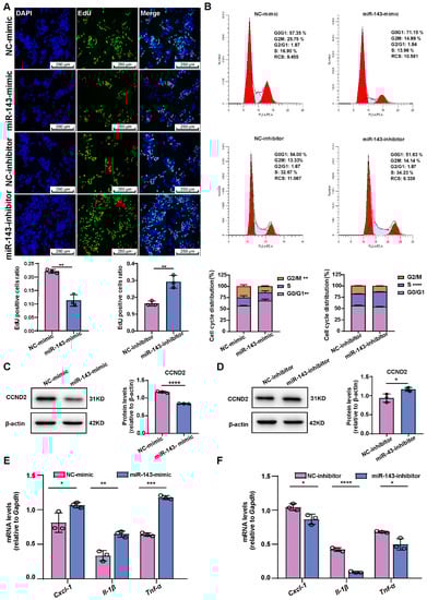 miR-143-3p inhibits GCs’ proliferation and induces senescence characterized by a distinct SASP. (A) EdU assays showed the effect of the miR-143-3p mimic and inhibitor on GCs’ proliferation. The scale bar = 250 μm. Green, EdU positive. Blue, DAPI. (B) Flow cytometry results showed the impact of miR-143-3p on the cell cycle of GCs transfected with an miR-143-3p mimic, miR-143-3p inhibitor, or the respective NC. (C,D) Protein level of CCND2 in GCs transfected with miR-143-3p mimic and an miR-143-3p mimic, miR-143-3p inhibitor, or the respective NC. (E,F) qRT-PCR analysis of the indicated SASP factors in GCs transfected with an miR-143-3p mimic, miR-143-3p inhibitor, or the respective NC. NC-mimic = mimic negative control, NC-inhibitor = inhibitor negative control. Data are presented as the mean ± SD from at least three independent experiments. * p < 0.5, ** p < 0.01, *** p < 0.001, **** p < 0.0001.