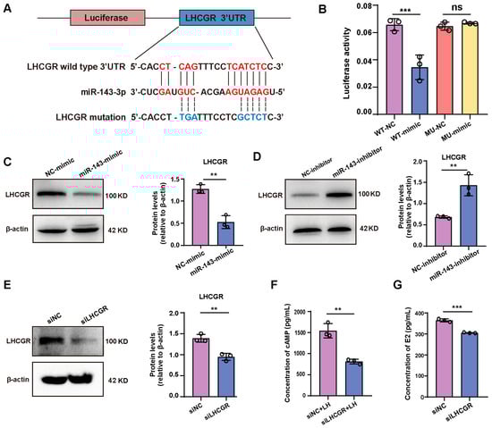 miR-143-3p inhibits E2 synthesis in GCs by targeting Lhcgr. (A) miR-143-3p was predicted to bind to the 3’ UTR region of Lhcgr mRNA. (B) A luciferase reporter plasmid containing either the wild-type or mutant UTR region of Lhcgr was constructed and co-transfected with the miR-143-3p mimic or miR-143-3p NC, respectively, in 293T cells. The relative Renilla luciferase activity was normalized to the firefly luciferase activity. (C,D) Protein levels of LHCGR in GCs transfected with miR-143-3p mimic, miR-143-3p inhibitor, or the respective NC. (E) Protein level of LHCGR in GCs transfected with siNC and siLHCGR. (F) Intracellular cAMP concentration in GCs transfected with siNC and siLHCGR. (G) E2 concentration in culture supernatant from GCs transfected with siNC and siLHCGR. siNC = negative control siRNA, siLHCGR = Lhcgr siRNA. All data are presented as the mean ± SD from at least three independent experiments. ** p < 0.01, *** p < 0.001, ns = not significant.
