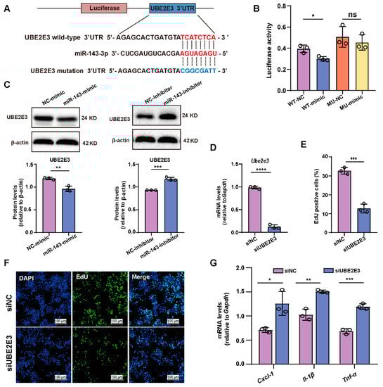 To investigate the molecular mechanisms underlying the observed effects of miR-143-3p overexpression on GC proliferation and SASP factor, we conducted further investigations to identify potential targets of miR-143-3p involved in regulating proliferation, and we identified Ube2e3 as a potential target of miR-143-3p (Figure 5A). To confirm this, we constructed a luciferase reporter vector containing either the wild-type or mutated 3′ UTR of Ube2e3, which were co-transfected with either an miR-143-3p mimic or NC into 293T cells. The miR-143-3p mimic significantly reduced the luciferase activity of the wild-type Ube2e3. In contrast, there was relief in suppression when the 3′ UTR of Ube2e3 was mutated (Figure 5B), indicating that miR-143-3p directly targets Ube2e3. Furthermore, miR-143-3p overexpression significantly downregulated UBE2E3 expression, while inhibition of miR-143-3p had the opposite effect (Figure 5C). Additionally, blocking the expression of Ube2e3 significantly inhibited GCs’ proliferation (Figure 5D–F) and SASP factor (Cxcl-1, Il-β, and Tnf-α) expression (Figure 5G), similar to the effects of the miR-143-3p mimic. These results demonstrate that miR-143-3p inhibited GC proliferation and induced SASP factor expression by directly binding to the 3′ UTR of Ube2e3.