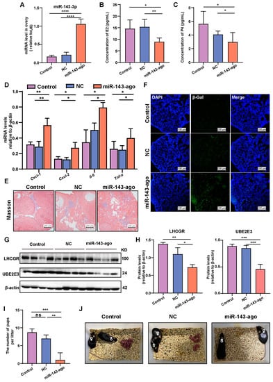 Overexpression of miR-143-3p accelerated ovarian aging in vivo. (A) Efficiency of miR-143-3p agomir intraperitoneal injection in mice was confirmed using qRT-PCR. miR-143-ago represented miR-143-3p agomir. (B,C) Serum E2 and P4 concentrations of control mice and mice injected with miR-143-3p agomir and negative control. (D) qRT-PCR analysis of the indicated SASP factors in ovaries from mice after injection with miR-143-3p agomir. (E) Masson staining of the ovaries from mice injected with miR-143-3p agomir and negative control. The scale bar = 200 μm. (F) β-galactosidase staining of the ovaries from mice after injection with miR-143-3p agomir. The scale bar = 100 μm. Green, β-galactosidase positve. Blue, DAPI. (G,H) The expressions of LHCGR and UBE2E3 in mice after injection with miR-143-3p agomir. (I,J) The litter size of control mice and mice injected with miR-143-3p agomir and negative control. All data are presented as the mean ± SD from at least three independent experiments. * p < 0.5, ** p < 0.01, *** p < 0.001, **** p< 0.0001, ns = not significant.