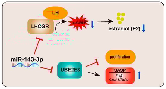 In this study, we found that ovarian dysfunction in aged mice is correlated with elevated levels of miR-143-3p in ovaries. Our results revealed that miR-143-3p plays a dual role in regulating GCs’ senescence. On one hand, miR-143-3p downregulated the expression of LHCGR, which in turn reduced cAMP production and limited steroid hormone synthesis, ultimately resulting in decreased levels of E2. On the other hand, miR-143-3p directly targets UBE2E3, leading to suppressed GC proliferation and inducing SASP factors. Collectively, these effects of miR-143-3p contribute to the age-related decline in ovarian hormonal function and GCs’ senescence (Figure 7).