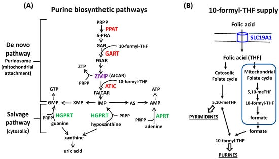 In the de novo purine synthesis, folic acid, in the form of tetrahydrofolate (THF), is the carrier of 1C units primarily derived from amino acid catabolism. THF is converted to formyl-THF through multiple reactions taking place in the cytosol and/or the mitochondria (Figure 1B). Because folic acid is a vitamin that cannot be synthesized inside the cells, transport from the extracellular environment is essential. There are three types of folate transporters: the reduced folate carrier (RFC), proton-coupled folate transporter (PCFT), and folate receptors (FRs) [28]. Recently, it has been reported that human cell lines expressing low levels of SLC19A1 preferentially use the cytosolic carbon flux, instead of the mitochondrial, for the synthesis of nucleotides [12].