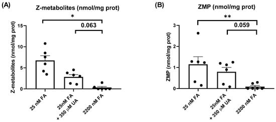 Cantor et al.; reported that medium containing uric acid (UA) at a physiological concentration (350 µM) inhibits uridine monophosphate synthase (UMPS) thus altering pyrimidine, but not purine, biosynthesis [22]. As shown in Figure 2B, Jurkat cells maintained in RPMI containing 350 µM UA and 25 nM FA (both physiological concentrations) presented similar levels of ZMP to cells maintained with only 25 nM FA. In conclusion, physiological levels of folic acid induce ZMP accumulation in Jurkat cells independently of the presence of uric acid in the medium. Similar results were obtained when the data were expressed in µM (Supplementary Materials Figure S2).