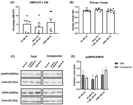 Intracellular levels of the most abundant purine nucleotides were determined by HPLC (Table 1). When the results were expressed as nmol/mg protein, there were not significant differences in the levels of ATP, ADP, AMP, GTP, GDP, and GMP in the cells treated with different media. There was a tendency for lower ATP levels in cells maintained with physiological FA (25 nM), that only reached statistical significance when the results were expressed as µM (Supplementary Materials Table S1). The AMP/ATP ratio did not change with the different media (Figure 3A), as well as the adenylate energy charge (Figure 3B), which is defined as the ratio ([ATP] + 1/2 [ADP])/([ATP] + [ADP] + [AMP]) by Atkinson and Walton [23]. AMPK was not activated in Jurkat cells maintained with physiological levels of FA or physiological levels of FA plus UA (Figure 3C). The pAMPK/AMPK ratio did not change in the cells maintained with different media, when analyzing either the cytoplasmic or total extracts (Figure 3D).