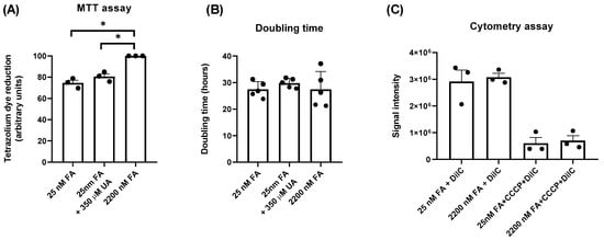 Physiological levels of folic acid decrease tetrazolium dye reduction (MTT assay) by Jurkat cells, without altering the mitochondrial membrane potential. (A) Jurkat cells were incubated for 5 days in RPMI medium containing 25 nM FA, 25 nM FA plus 350 µM UA, or 2200 nM FA and MTT assay was performed as described in Material and Methods. The graph represents the mean ± SEM of 3 independent experiments, using 2200 nM FA as a reference condition for normalization of the data and expressing the results as arbitrary units (AU). * p < 0.05. One-way ANOVA, uncorrected Fisher’s LSD test. (B) Jurkat cells were treated with different media, as described in (A), and doubling time was obtained using the formula described in Materials and Methods. This graph represents the mean ± SEM of 5 independent experiments. One-way ANOVA, uncorrected Fisher’s LSD test. (C) Jurkat cells cultured in RPMI medium with 25 nM FA or 2200 nM FA were incubated with DilC or DilC plus CCCP and signal intensity was quantified by cytometry. Results represent the mean ± SEM of 3 independent experiments. Unpaired t-test comparing 2200 nM vs. 25 nM FA with or without CCCP addition.
