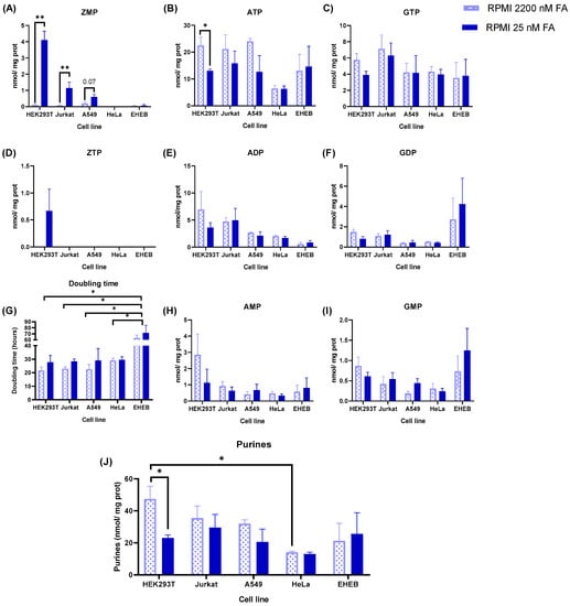 Physiological levels of folic acid induce ZMP accumulation in different tumoral cell lines. (A–F,H,I) HEK293T, Jurkat, A549, HeLa and EHEB cells were incubated for 5 days in RPMI containing 25 nM FA or 2200 nM FA. Cell extracts were obtained with 0.4 N PCA and nucleotides determined by HPLC. Results were expressed as nmol/mg protein. The graphs represent the mean ± SEM of at least 3 independent experiments, expressing the results as nmol nucleotide/mg protein. * p < 0.05; ** p < 0.01. Unpaired t-test comparing 2200 nM vs. 25 nM FA within each cell line. (G) Doubling time of the cells was obtained using the formula described in Materials and Methods. Unpaired t-test comparing 2200 nM vs. 25 nM FA within each cell line. One-way ANOVA, uncorrected Fisher’s LSD test comparing each condition between different cell lines. * p < 0.05. (J) Total purine concentration, calculated as the summatory of adenylates plus guanylates, in each cell line cultured with RPMI containing 2200 nM or 25 nM FA. Results were expressed as nmol/mg protein. Differences between cell lines were analyzed with a one-way ANOVA, uncorrected Fisher’s LSD test. Differences within cell lines, comparing 2200 nM vs. 25 nM folic acid, were analyzed with an unpaired t-test. * p < 0.05.