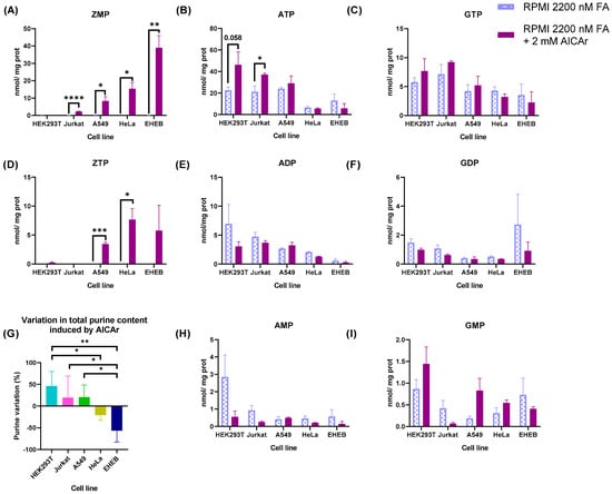 Purine alterations in different cell lines treated with 2 mM AICAr. HEK293T, Jurkat, A549, HeLa and EHEB cells were maintained for 4 days in RPMI containing 2200 nM FA and then incubated with the same medium with or without 2 mM AICAr for 24 h. (A–F,H,I) Cell extracts were obtained with 0.4 N PCA and purine levels determined by HPLC. Results were expressed as nmol/mg protein. The graphs represent the mean ± SEM of at least 3 independent experiments, expressing the results as nmol nucleotide/mg protein. * p < 0.05; ** p < 0.01; *** p < 0.001; **** p < 0.0001. Unpaired t-test comparing 2200 nM FA vs. 2200 nM FA + 2 mM AICAr for each cell line. (G) Variation of total purine content induced by AICAr. Total purine concentration for each cell line and condition was calculated as the summatory of adenylates plus guanylates. The graph represents the increase or decrease in total purines for each cell line treated with AICAr and compared with untreated cells. Results are expressed in percentages. * p < 0.05; ** p < 0.01. One-way ANOVA, uncorrected Fisher’s LSD test.