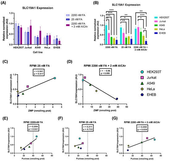 SLC19A1 mRNA expression in different cell lines. (A,B) HEK293T, Jurkat, A549, HeLa and EHEB cells were incubated for 5 days in RPMI containing 25 nM FA, 2200 nM FA, or 2200 nM FA + 2 mM AICAr (AICAr was added 24 h before collecting the cells). Total RNA was extracted and SLC19A1 mRNA levels quantified by qRT-PCR as described in Material and Methods. Results were expressed in arbitrary units (AU), using HEK293T cell line maintained with 2200 nM FA as a reference condition for normalization of the data, and grouped per cell line studied (A) or per condition assayed (B). The graphs represent the mean ± SEM of 3 independent experiments. One-way ANOVA (A) and two-way ANOVA (B), uncorrected Fisher’s LSD test. * p < 0.05; ** p < 0.01; *** p < 0.001. (C,D) Correlation between ZMP levels (in nmol/mg protein) and SLC19A1 expression (AU) in cells treated with 25 nM FA (C) or 2200 nM FA + 2 mM AICAr (D). (E–G) Correlation between total purine content, calculated as the summatory of adenylates and guanylates (in nmol/mg protein) and SLC19A1 expression (AU) in cells treated with 2200 nM FA (E), 25 nM FA (F), or 2200 nM FA + 2 mM AICAr (G). r = Pearson correlation coefficient.
