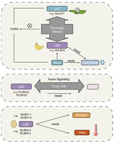 Abiotic stress response mechanisms of the LBD gene in different species. The diagrams provide an overview of how the LBD gene helps different plant species reduce injury caused by abiotic stress.