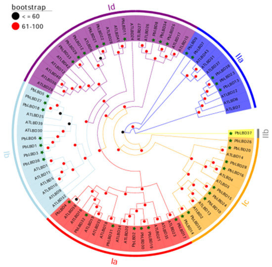 The phylogenetic tree of the boundary domain genes of the lateral organs in P. bournei and A. thaliana. The asterisk represent the members of P. bournei. The numbers on the branch represent the reliability of the node with 1000 bootstrap. Branches of different categories are in different colors. Each LBD subclass is indicated by an arc. As indicated in the phylogenetic tree clustering structure, Class I was further classified into subclasses Ia, Ib, Ic, and Id; Class II includes subclasses IIa and IIb.