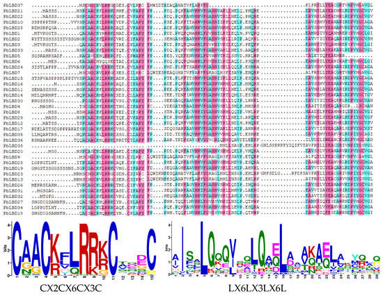 Sequence alignment of conserved protein domains within the boundary domain family in the lateral organs of P. bournei. The CX2CX6CX3C zinc finger-like domain was present in the 38 proposed PbLBD protein sequences, while a complete LX6LX3LX6L domain was only presented in some sequences. The other sequences contained only a partial LX6LX3LX6L domain. The conserved motif logos were generated with different colors. The blue and purple highlights were applied to identify the unique properties of the same conserved sequences.
