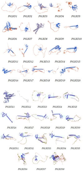 A multiple sequence comparison of 38 PbLBD proteins was performed using the software DANMAN (version 9) (Figure 4), resulting in the identification of two conserved protein domain sequences. All members from the two subclasses of PbLBD shared a conserved domain CX2CX6CX3C. However, only 10 sequences, namely PbLBD2, PbLBD11, PbLBD12, PbLBD15, PbLBD17, PbLBD19, PbLBD21, PbLBD22, PbLBD24, and PbLBD30, contained a second conserved LX6LX3LX6L leucine-zipper-like domain. The remaining members only possessed a partial domain. The overall composition of the leucine-zipper-like domain was V81%I61%X6V35%X6L50%X6L60%. The online software SWISS-MODEL (https://swissmodel.expasy.org/interactive) predicted the optimal structure of the LBD family in P. bournei based on the GMQE value closest to one, and it also predicted the structures of the members from the two subclasses. The modeling analysis revealed that the spatial 3D structure of each related LBD exhibited a symmetric “Y”-like shape (Figure 5). It was speculated that due to the homology of protein sequences and conserved domain structure at both the C- and N-terminus, these two subfamilies shared functional similarities.