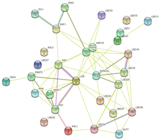 The interaction relationships of 20 relevant proteins were predicted with the online tool String (https://cn.string-db.org/, accessed on 14 July 2022), and a protein interacting network was subsequently constructed. Based on known homologous proteins encoded in Arabidopsis as a reference, the STRING database (https://stringdb.org, accessed on 14 July 2022) was applied to predict and analyze the interaction network of LBD domain proteins. The following parameters were set for the STRING database: network type was set to full STRING network, the network edges were evidence-based, and a medium confidence parameter (0.4) was used to represent the minimum interaction score. To ensure data accuracy, the maximum number of interactions was capped at 10.