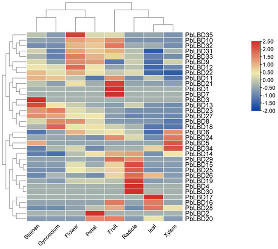 Expression of 35 LBD genes in various tissue of P. bournei. The heat map scale showed a log2 value from −2.00 (in dark blue) to 2.50 (in dark red) indicating a low expression level to a high expression level.