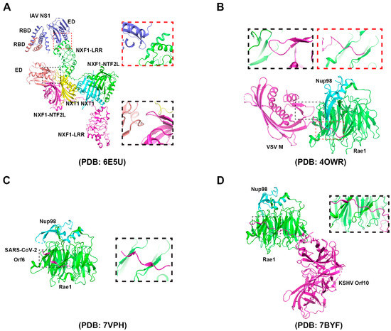 | Vesicular stomatitis virus (Rhabdoviridae) | M | Hijacking the Rae1-Nup98 complex [61,120] | |