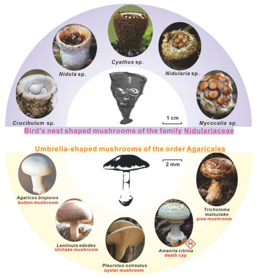 - Kraisitudomsook, N.; Healy, R.A.; Smith, M.E. Molecular systematics and taxonomic overview of the bird’s nest fungi (Nidulariaceae). Fungal Biol. 2021, 125, 693–703. [Google Scholar] [CrossRef]