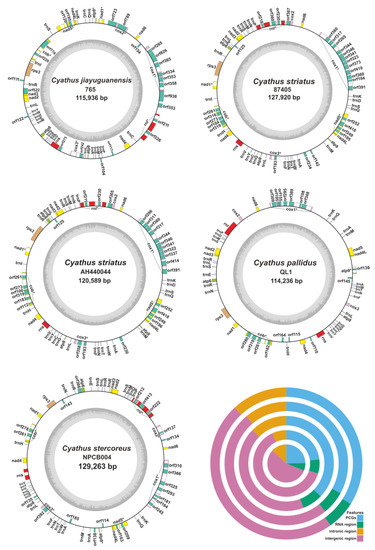 Circular maps of the mitogenomes of five Cyathus species. Genes are shown by blocks of different colors. The doughnut chart represents different compositions of the total mitochondrial genomes of the five Cyathus species. From the inner doughnut to the outer ring, C. stercoreus NPCB004, C. pallidus QL1, C. jiayuguanensis 765, C. striatus 87405, and C. striatus AH44044 are sequenced. The symbol * indicates that the corresponding gene contains an intron (introns).