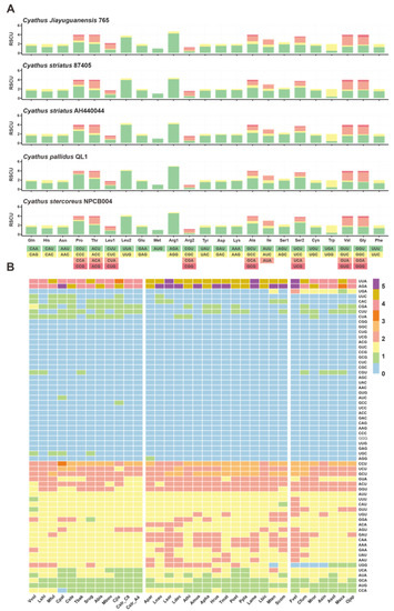 (A) Stacked column plots of the RSCU of the mitochondrial genomes of five Cyathus species. (B) Heatmap of the RSCU of the mitogenomes of 34 Agaricales species.