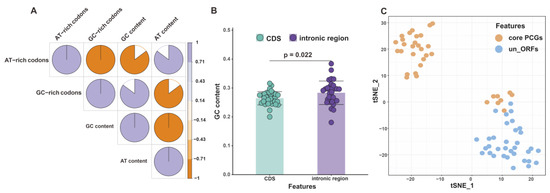 (A) Pearson correlation matrix between the usage of AT-rich codons, GC-rich codons, AT content, and GC content in 34 Agaricales species (B) GC content of mitochondrial CDS and intronic regions from 34 Agaricales species. (C) T-SNE analysis of the RSCU in mitochondrial core PCGs and un_ORFs.