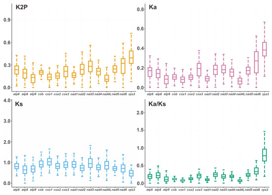 Fifteen core protein-coding genes (atp6, atp8, atp9, cob, cox1, cox2, cox3, nad1, nad2, nad3, nad4, nad4L, nad5, nad6, and rps3) from 34 mitogenomes were individually aligned using MAFFT (v7.453). Synonymous (Ks) and non-synonymous (Ka) substitution rates were calculated using DnaSP (v6.12.03) (http://www.ub.edu/dnasp/, accessed on 26 March 2023). The Ka/Ks ratio was subsequently computed to explore evolutionary pressure. To analyze the genetic distance of the core PCGs, MEGA 11 (v11.0.13) (https://megasoftware.net/, accessed on 26 March 2023) was used to align the identical type of PCGs and calculate Kimura 2-parameter (K2P) distances between pairs among 15 PCGs.