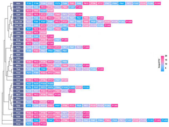 Position class (Pcl) is a term used to define the exact location of the coding region in the cox1 gene [41], typically used to characterize the positional information of introns contained in the cox1 gene. Two hundred thirty-six introns detected in the cox1 genes of 34 Agaricales mushrooms were categorized into 43 Pcls based on the sequence comparison of the cox1 gene with a reference species, Ganoderma calidophilum [42]. Discrepancies in the class and quantity of introns in 34 species indicated the occurrence of gain or loss of introns. Pcls occurring in more than or equal to 20% of the 34 species were defined as common insertion sites, while the rest were classified as rare insertion sites. This study identified 15 common Pcls and 28 rare Pcls, of which P1305 was the most universally distributed intron detected in 20 of the 34 species. P612 ranked second and was found in 19 of the 34 species. Rare Pcls (P262, P547, P1193, P1458, P864, P193, P196, P278, P941, P385, P387, P1122, P371, P537, P668, and P821) were present in only 1 of the 34 mitogenomes (Figure 6). Interestingly, several rare Pcls, especially P941, P278, and P369, were identified in species with distant evolutionary relationships, such as Rhodotorula mucilaginosa, G.meredithae, Fomitiporia mediterranea, and G. calidophilum from Basidiomycota, suggesting possible gene transfer events.