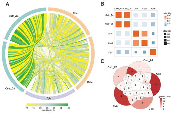 (A) Mitogenome synteny among the five Cyathus species, links with identity > 70% are shown. (B) The protein sequence identities of fourteen concatenated conserved genes among five Cyathus species. (C) Homologous un_ORFs (nucleotide sequence identity > 80%) shared among five Cyathus species.