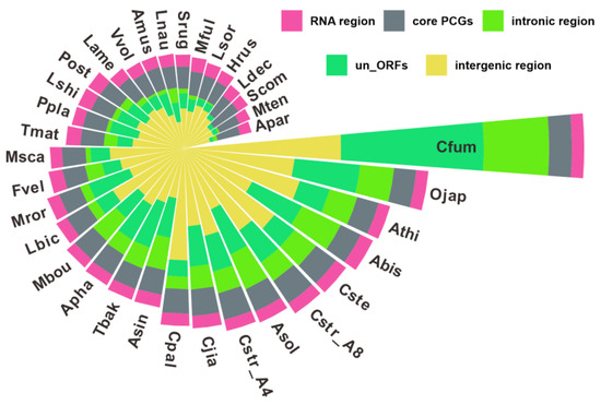 A comparative analysis of the mitochondrial genomes of 34 Agaricales species, including five Cyathus species, was conducted to understand their mitochondrial features better. The mitogenome sizes showed considerable variation, ranging from 43,328 bp (Asterophora parasitica) to 256,807 bp (Clavaria fumosa) (Figure 8, Table S1). The analysis encompassed five genomic components, namely un_ORFs, intronic regions, intergenic regions, RNA regions, and core PCGs, to determine their contribution to mitogenomic differences. The relative content of each component displayed substantial disparity among the mushroom species studied. Core PCGs and RNA regions occupied nearly 50% of mitogenomes in mushrooms such as Asterophora parasitica, Schizophyllum commune, and M. tenuissimus, while accounting for only one-eighth or less in others, including C. striatus 87405, Omphalotus japonicus, and Clavaria fumosa. Intergenic regions also contributed to mitogenome size variation, constituting 46% of C. jiayuguanensis 765 and 28% of Leucoagricus naucinus mitogenomes. Meanwhile, un_ORFs percentages ranged from 5% to 30% across species (Figure 8, Table S1).