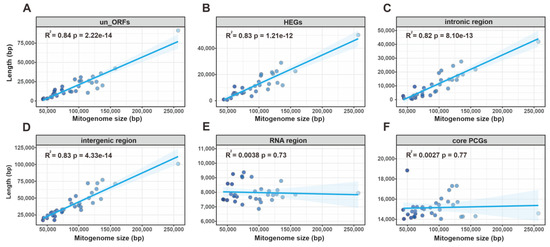 Correlation analysis between the lengths of mitogenomes and the lengths of un_ORFs (A), HEGs (B), intronic region (C), intergenic region (D), RNA region (E), and core PCGs (F).