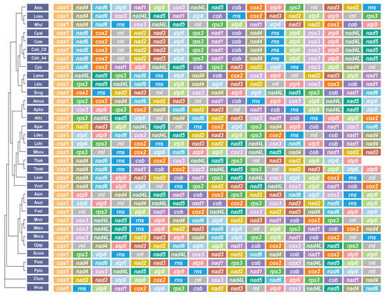 Gene order analyses for 34 Agaricales mitogenomes. The same gene is represented by the same background color. All genes (fifteen core PCGs and two ribosomal RNAs) are shown in the order of their appearance in the mitogenome, starting with cox1.